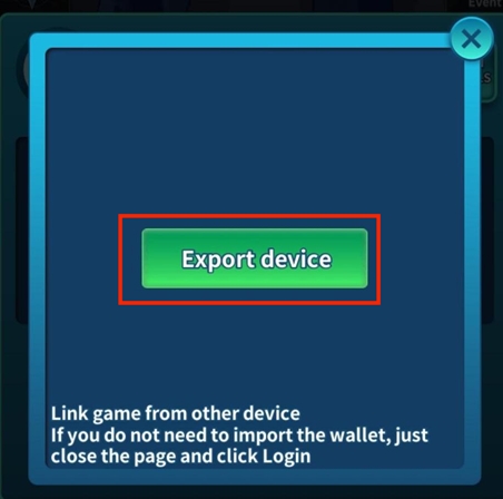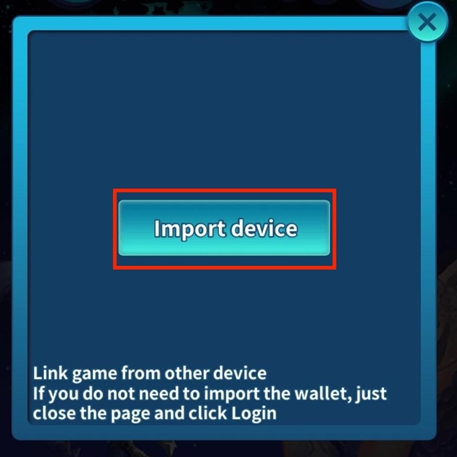 2b. When you open the game on the device previously linked to your account, click “Login” and a pop-up will appear. If you don’t need to import your wallet, the system will automatically create a new wallet and import all of your assets. Just close the pop-up and click “Login.”